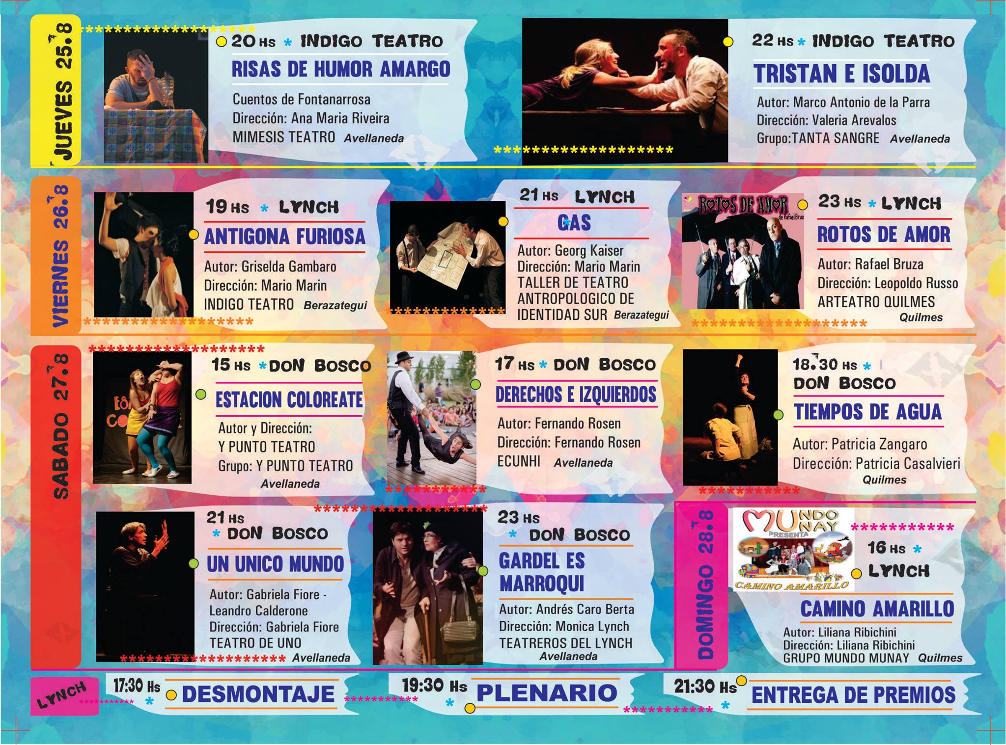 Del festival participarán teatreros del Centro Cultural Justo Lynch de Wilde, Sarandiarte de Sarandí, el Teatro Don Bosco de Quilmes e Índigo Teatro de Berazategui, este último inaugurará el ciclo, con las obras Risas de humor amargo, cuentos de Roberto Fontanarrosa (dirigida por Ana María Riveira) y Tristán e Isolda, de Valeria Arevalos. Los horarios serán a las 20 y 22 horas y tendrán las actuaciones de los grupos Mimesis Teatro y Tanta Sangre, ambos de Avellaneda, respectivamente.