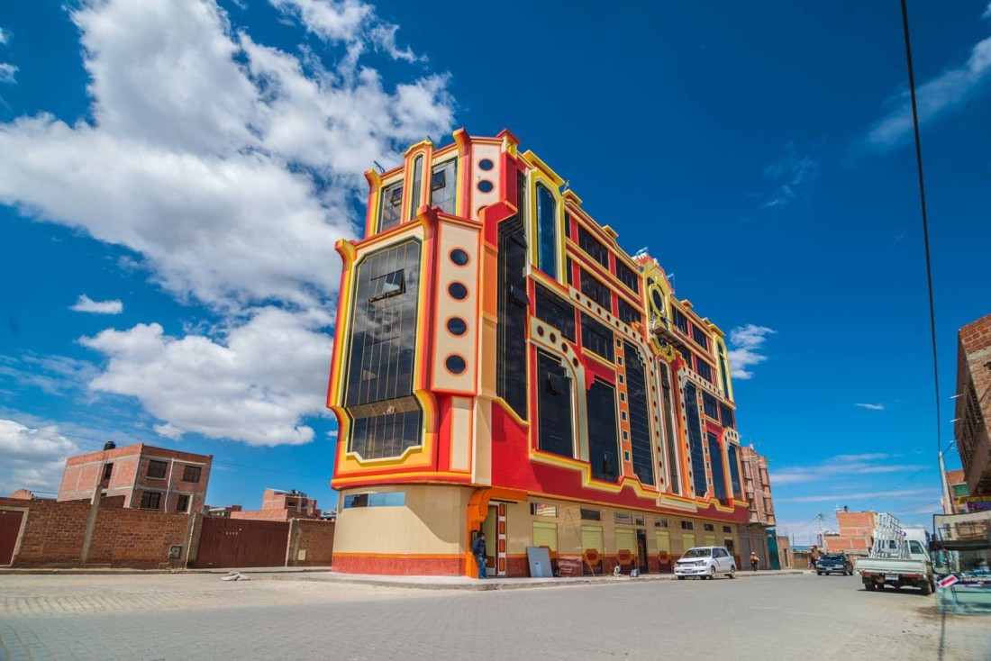 Movido por la idea de encontrar una identidad arquitectónica aimara, sus edificios –en general, encargados por familias ricas- son una muestra de colorido, desfachatez y tradición. Únicas en el mundo, sus obras desafían los conceptos actuales de belleza, simplicidad y funcionalidad.
